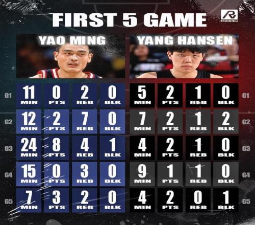 第1场小杨只拿到2分之后,很多人还把他和姚明进行了对比,那么杨瀚森对比姚明,在生涯前5场比赛里的数据究竟如何?现在也是有媒体带来了一个重磅的揭秘,看一看杨瀚森是否能够和姚明进行pk。
