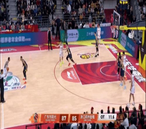 场面处于落后,但广东队没有放弃,还是靠防守,利用全场紧逼连造浙江2次失误,徐杰王少杰艰难制造4罚追回3分,37.8秒,陈家政命中踩线三分助力广东扳平。