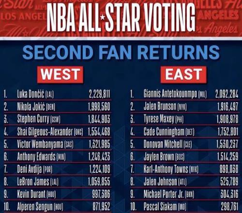 全明星第二轮投票结果出炉,东西部前五球员没有变化,票王还是东契奇,获得了222多万票,字母哥则是东部第一,距离东契奇也就十多万的差距,也是有机会的。西部前五分别是东契奇、约基奇、库里、亚历山大和文班亚马,东部前五则是字母哥、布伦森、马克西、康宁汉姆和米切尔。按照规定,全明星首发球迷投票占比50%,NBA球员和媒体小组占据的比例均为25%。